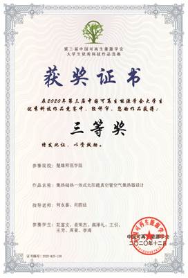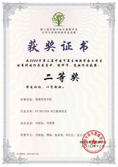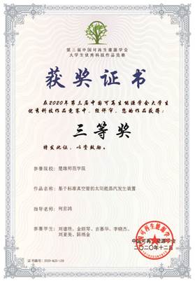 第三届中国可再生能源学会大学生优秀科技作品竞赛,由中国可再生能源学会主办,全国新能源科学与工程专业联盟与沈阳工业大学承办。工作共收到120所高校申报的作品734件,涉及风能、生物质能、太阳能、地热 能、海洋能、天然气水合物、氢能等领域。经过线上分组答辩和答辩委员会综合评议,我校同学能获此佳绩,体现了我校新能源科学与工程、电气工程及其自动化学生的专业素养和创新实践能力,也是充分展示了我校应用型创新人才培养的成果。